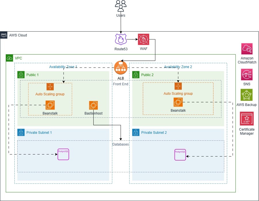 A camada de aplicação é executada sobre instâncias Amazon EC2 gerenciadas pelo AWS Elastic Beanstalk. O Elastic Beanstalk opera com grupos de Auto Scaling em pelo menos duas Availability Zones, garantindo que múltiplas instâncias estejam ativas simultaneamente. Esse modelo permite absorver variações de carga e mantém a aplicação disponível mesmo em caso de falha de instâncias ou de uma zona inteira. As instâncias do Beanstalk estão posicionadas em sub-redes públicas, recebendo tráfego exclusivamente por meio do Load Balancer.